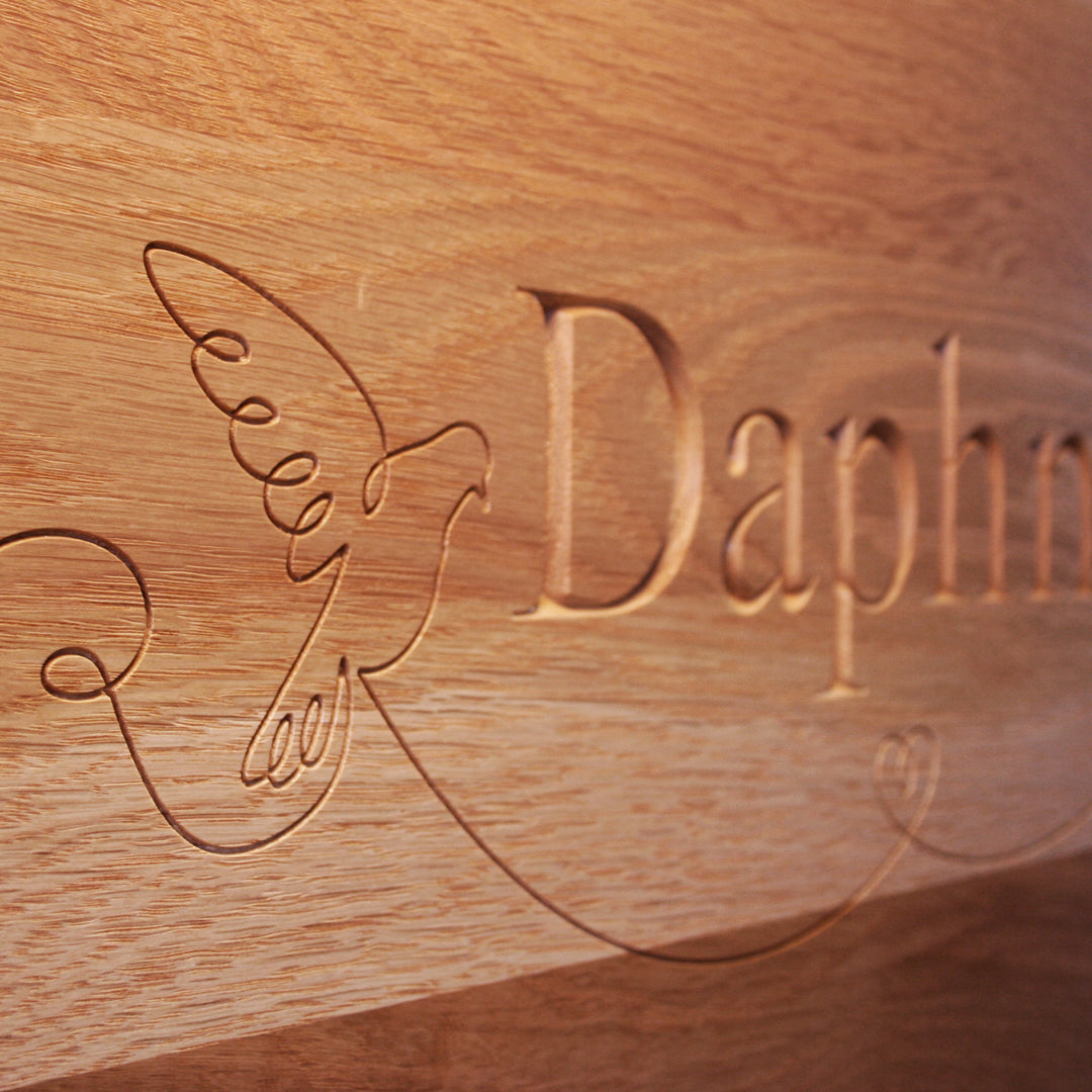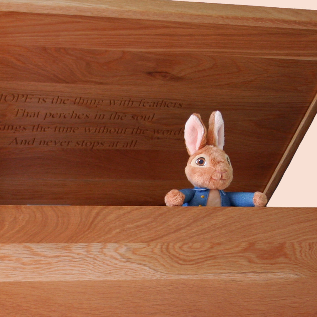 Share with us the lucky child’s name(s) and select from our extensive catalogue of beautiful motifs and our engravers will transform the front panel of your oak toy box into a family heirloom. Learn more.